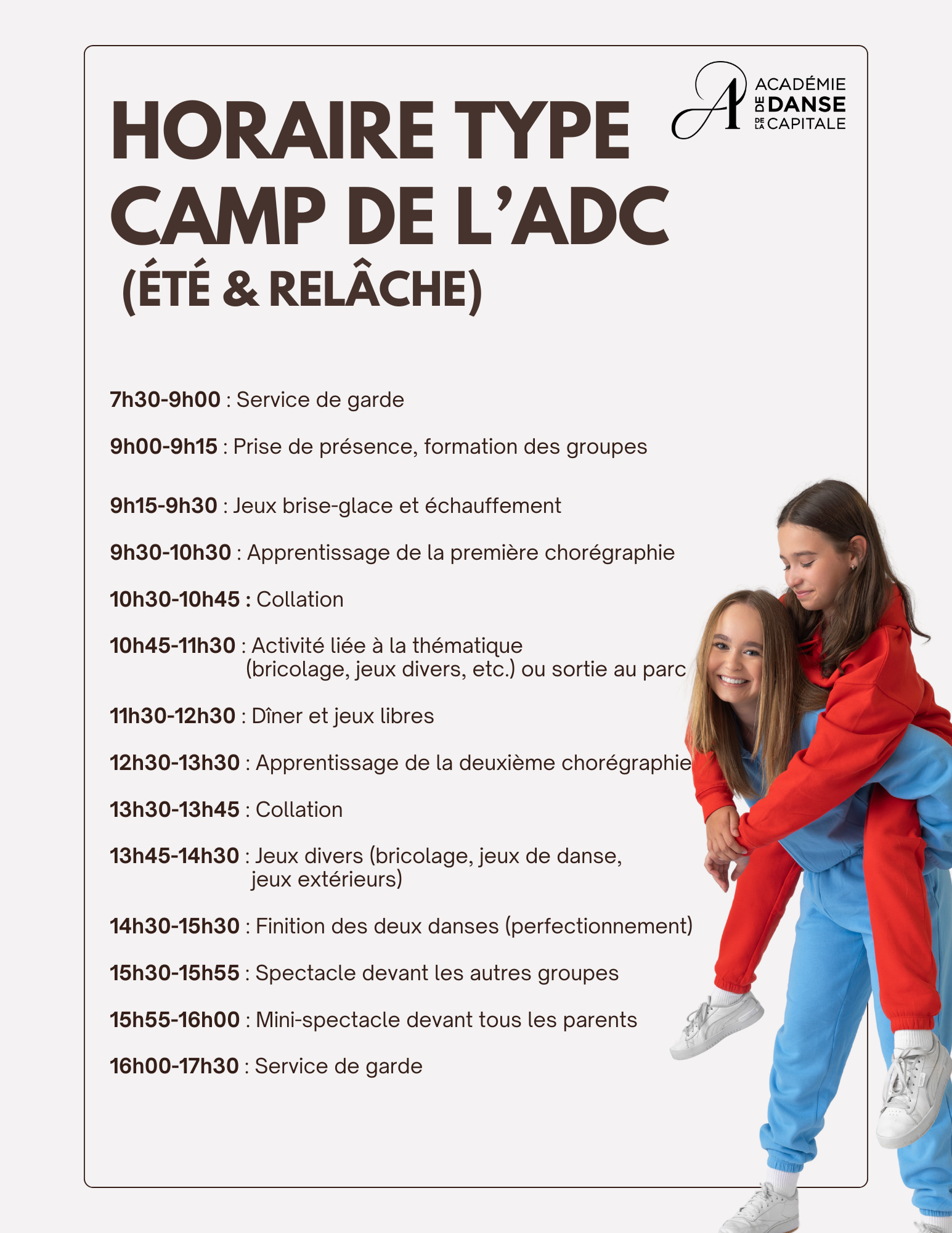 Voir l'horaire type d'une journée de camp ici : Horaire type (camp relâche)
